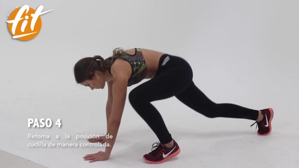 - Regreso a Cuclillas: Impulsa tus pies hacia adelante con un salto para volver a la posición de cuclillas, con los pies cerca de las manos.