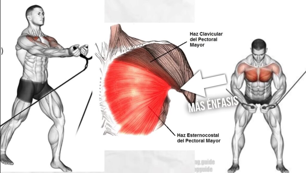 El pectoral mayor es un músculo grande en forma de abanico que cubre la parte superior del pecho. Se origina en el esternón, la clavícula y las costillas superiores, y se inserta en el húmero (el hueso del brazo). Su función principal es la aducción horizontal del brazo (mover el brazo hacia el centro del cuerpo a la altura del hombro) y la flexión del hombro (levantar el brazo hacia adelante). Ambos movimientos son primordiales en los ejercicios de press.