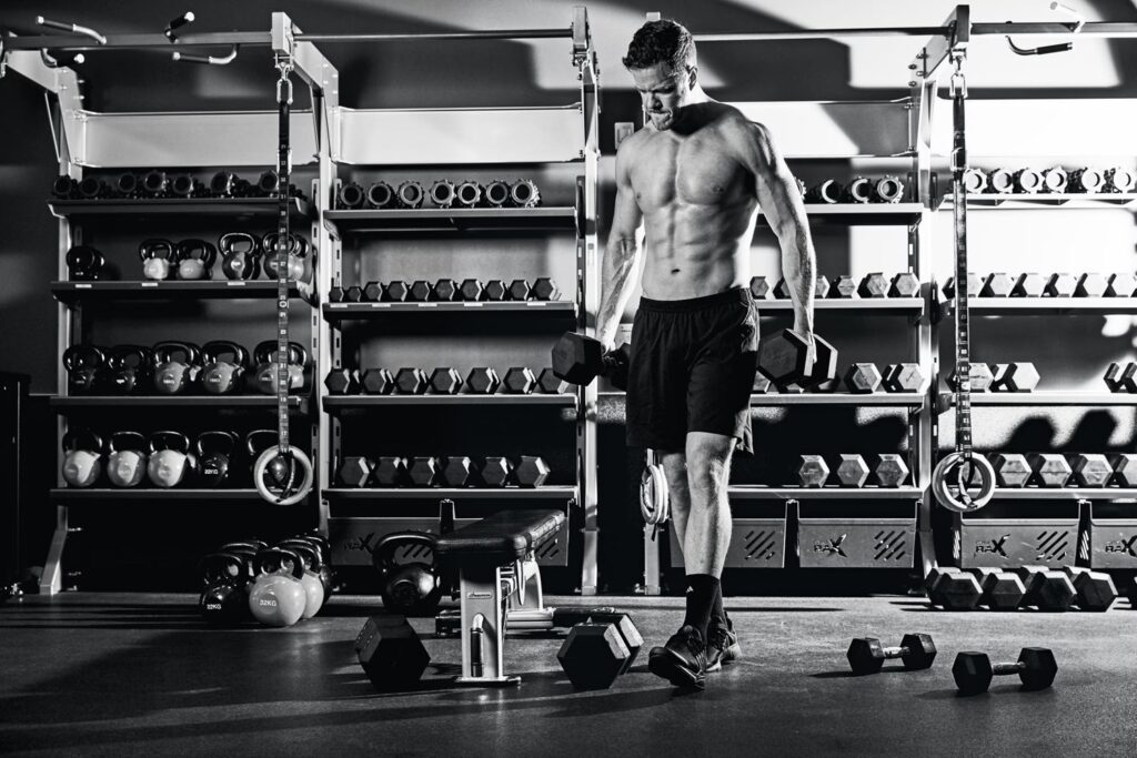 Una de las rutinas específicas que sigue, diseñada por Brad Feinberg, es un circuito intenso con mancuernas en formato de cuenta atrás. Consiste en 10 rondas, comenzando con 10 repeticiones de cada ejercicio en la primera ronda, luego 9 en la segunda, y así sucesivamente hasta llegar a 1 repetición en la décima ronda. Entre cada ronda, realiza 300 metros en una bicicleta de aire para mantener alta la intensidad cardiovascular.