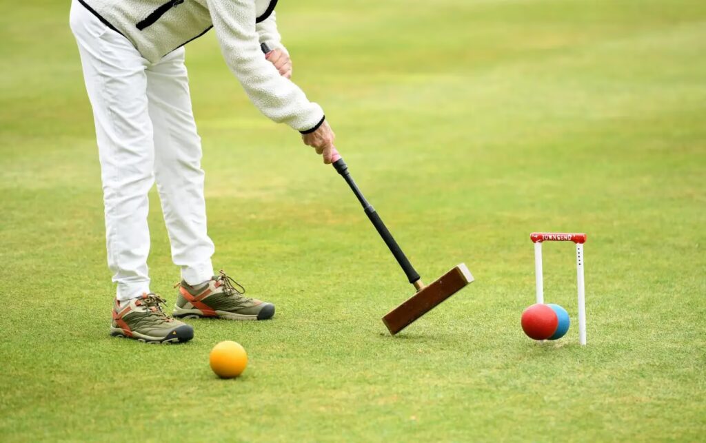 El croquet es un juego al aire libre que se juega en césped. Los jugadores usan un mazo de mango largo para golpear una pelota a través de una serie de aros pequeños de metal llamados wickets, con el objetivo de pasar por todos ellos y golpear una estaca final.