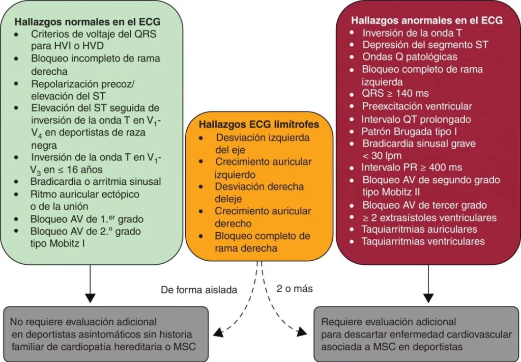 La presencia de cualquiera de estos hallazgos anormales requiere una evaluación cardiológica exhaustiva, que puede incluir pruebas como ecocardiograma, resonancia magnética cardíaca (RMC), monitorización Holter de 24 horas, prueba de esfuerzo, estudios electrofisiológicos o pruebas genéticas.