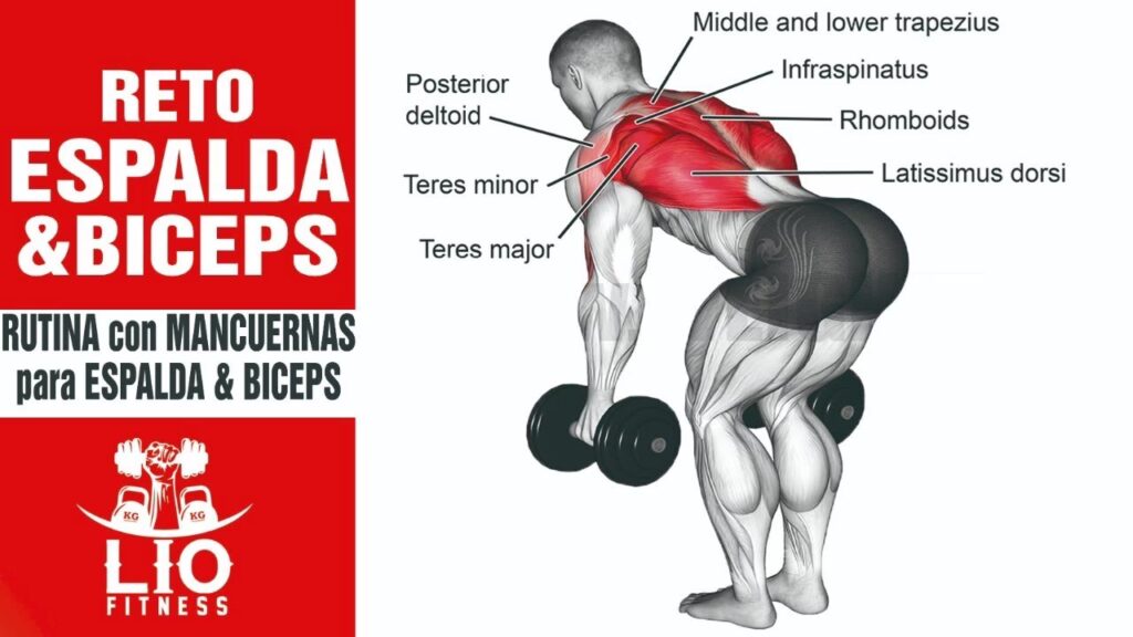 - Para Espalda: Remada con barra, remada con mancuerna a una mano, dominadas (si puedes hacer al menos 8 repeticiones).