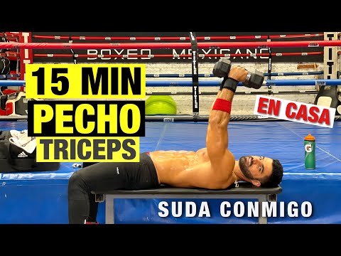 Series y Repeticiones: 3 rondas de 10 a 12 repeticiones (rompecráneos), seguidas inmediatamente por 8 a 10 repeticiones (press agarre cerrado/flexiones).
