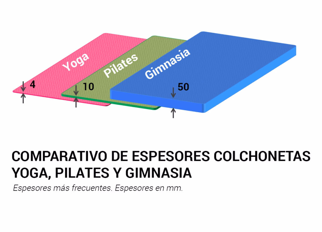 Para yoga y Pilates, donde se entrena descalzo y se prioriza la estabilidad y el contacto con el suelo, los grosores suelen variar entre 3 mm y 6 mm. Algunos prefieren hasta 8 mm para mayor comodidad en las rodillas, pero un grosor excesivo puede dificultar el equilibrio.